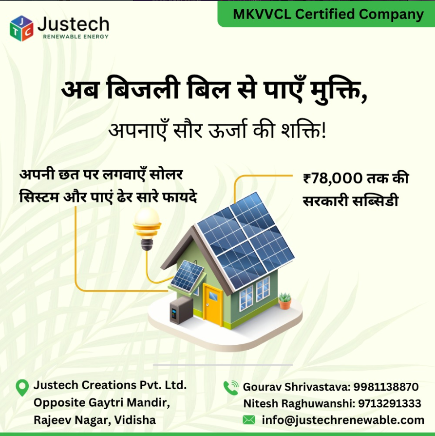 Posted on Mukesh ShrivastavaTrustindex verifies that the original source of the review is Google. Bahut badiya kaam, highly recommendablePosted on Brij SahuTrustindex verifies that the original source of the review is Google. Good workPosted on Nandkishor RaghuwanshiTrustindex verifies that the original source of the review is Google. Excellent customer support and installation of Roof top solar panels. I recommend for the JustechPosted on Rupesh RaghuvanshiTrustindex verifies that the original source of the review is Google. Excellent service and installation with timelyPosted on Shivraj RaghuwanshiTrustindex verifies that the original source of the review is Google. Excellent Service & Smooth Installation! I recently got a 5kV solar panel system installed by *JustTech Renewable Energy*, and I’m thoroughly impressed. From the initial consultation to the final setup, their team was professional, transparent, and punctual. The installation was done neatly, and they explained everything clearly. I’ve already started seeing the benefits on my electricity bill! Highly recommend JustTech for anyone considering switching to solar.Posted on shivam kushwahTrustindex verifies that the original source of the review is Google. Vidisha me sabse best👍Posted on Dr Swatak JainTrustindex verifies that the original source of the review is Google. Fully satisfied with the company work on my solar plant, behavior of the company owner is very friendly, very supportive and work done is very trusted , I recommend you "Justech Renewable" for your solar plant installation